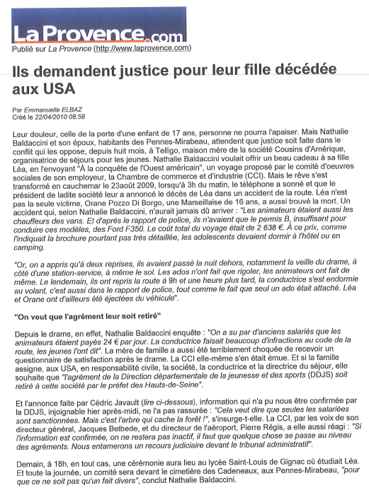 Ils voient revenir l’été et les colonies de vacances avec une angoisse mêlée de colère. Le 22 août 2009, leurs filles Léa Baldaccini, 17 ans, et Orane Pozzo di Borgo, 16 ans, ont trouvé la mort dans un accident de minibus lors d’un séjour en Californie, aux Etats-Unis. L’une des trois animatrices, qui faisait aussi fonction de chauffeur, s’était assoupie, épuisée, au volant. Près de deux ans après ce drame qui a brisé leur vie, les parents de ces deux adolescentes originaires des Bouches-du-Rhône ont fait de la sécurité des séjours pour mineurs à l’étranger un véritable « combat ». Ils sont allés le défendre jusqu’à l’Elysée, où ils avaient rendez-vous mercredi matin, et auprès du député de leur circonscription à l’Assemblée nationale.