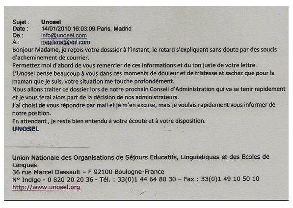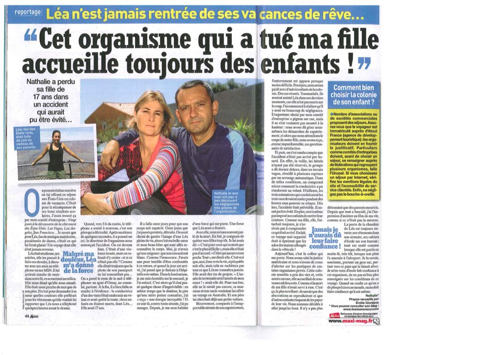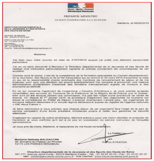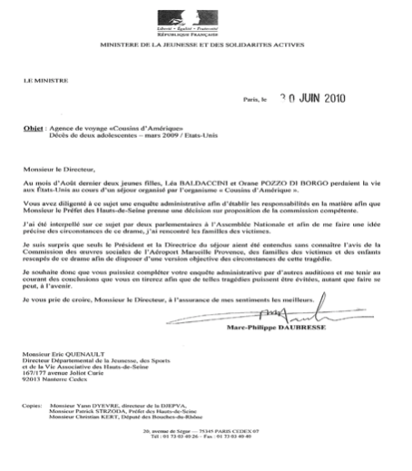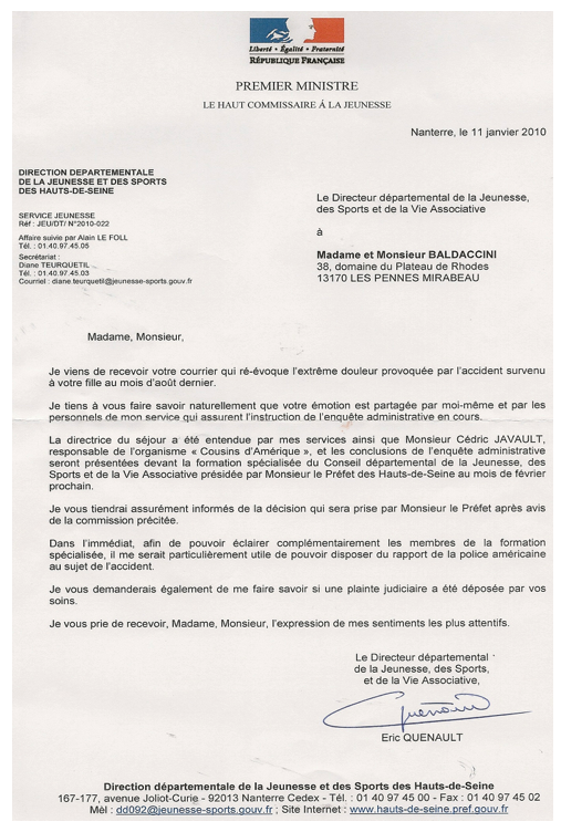 Suite à leur courrier adressé à la DDJS (Direction Départementale de la Jeunesse et des Sports) du 28 décembre 2009, les familles de Léa et Orane, le Comité d’Entreprise, les familles d’enfants blessés et traumatisés ont été surpris de ne pas être consultés. Seuls Monsieur Cédric Javault Président de l’organisme de voyages COUSINS D’AMERIQUE et la directrice du séjour ont été entendus (courrier du 11 janvier 2010). Peut-on légitimement penser que les conclusions de l’enquête administrative soient fiables ?